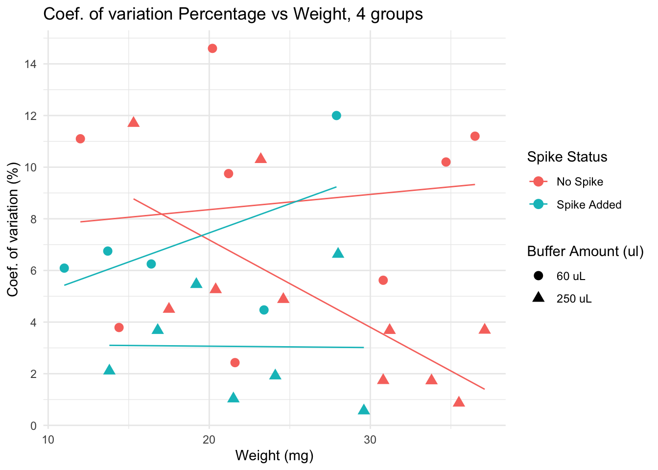 Here I use QCed results from an ELISA plate. All hair samples were obtained from the same person. I tested 3 variables: